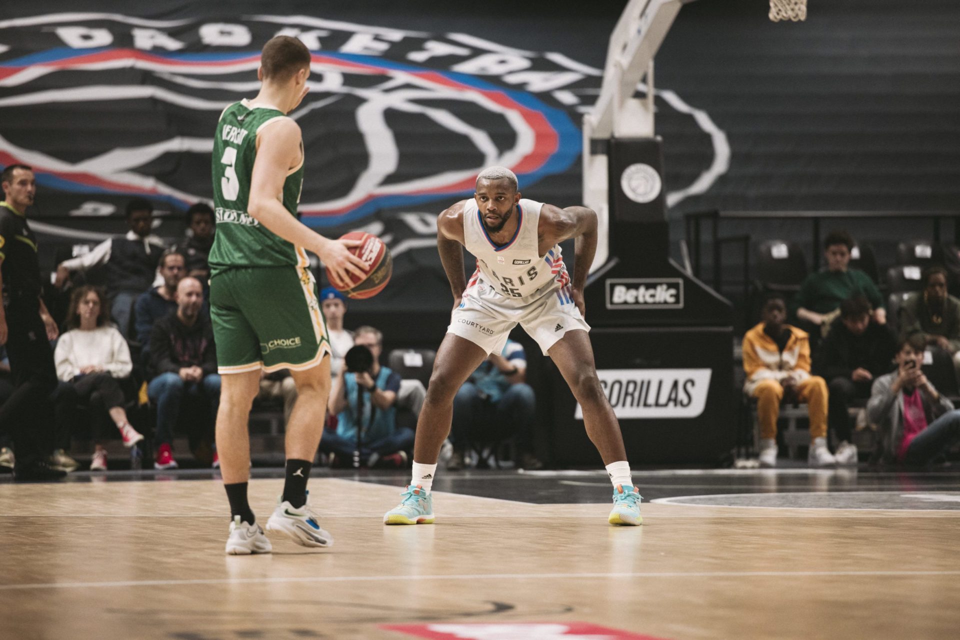 Devant 1640 spectateurs et des tribunes pleines, les parisiens démarrent de la meilleure des manières. Le style Weaver à base d’intensité défensive, de jeu rapide en attaque avec des renversements pour trouver les meilleurs tirs à trois points fonctionne. L’adresse est au rendez-vous et fait rugir Carpentier à plusieurs reprises, notamment avec un gros coup de chaud à trois points de Gauthier ‘Gucci’ Denis qui a enchainé trois trois points. On a eu le droit aussi à des shoots incroyables de Mister Tyrone Wallace qui a planté des stepback, des side-steps, des catch & shoot malgré la grosse main du défenseur devant lui. Lui et Kyle Allman Jr ont fait vibrer la Halle Carpentier avec leur vitesse. En revanche on pouvait déjà apercevoir les problèmes habituels de pertes de balle et d’adresse aux lancer-francs en première période… Les 20 premières minutes finissent à notre avantage 54 à 46.